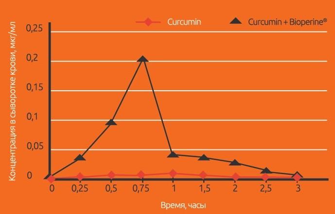 Совместный прием Bioperine® и куркумина повышает биодоступность куркумина на 2000 % (в 20 раз).